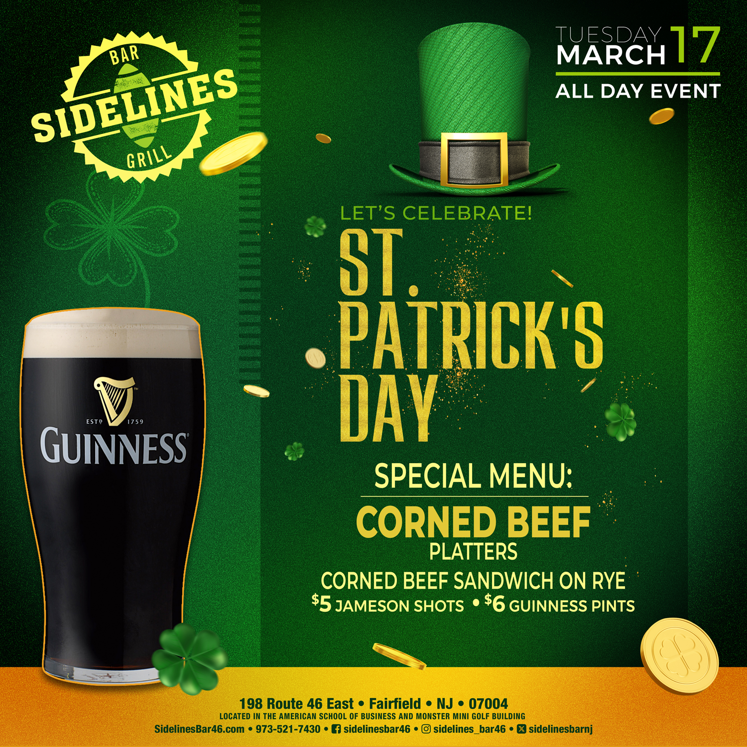 Corned Beef & Cabbage Platters • Corned Beef Sandwich On Rye • $5 Jameson Shots • $6 Guinness Pints
